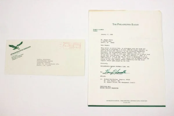 The letter from former Eagles President, Harry Gamble, served as notice to White that the Eagles were extending his contract for the 1989 season (a pretty easy decision). It is an interesting look at the NFL's pre-free agency era where power was completely with the club. He had a pretty sweet deal, too... 1989 called for a 110% increase of his previous season salary, pushing him up to $440k! See the lot.