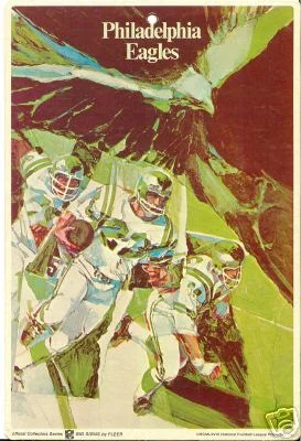 The Eagles poster features three unidentified players in-action, with a large eagle swooping down, talons extended in the background. At the top is "Philadelphia Eagles" in white text. It is interesting to note that the uniforms worn by the players are not true to the early 1970s release date. From 1969 - 1973, the team wore white helmets with green wings. It is likely that the painting used on the poster was created before that period.