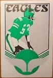 The Eagles sign has a player in green jersey framed by a thin black "shield-shaped" line - three thin green lines diagonally line each side of the bottom of the shield. "Eagles" text logo is in large, black type across the top - overlapping the depicted player's helmet in the center. One of my favorite features of this sign is the green circle at bottom-center with two silver eagle wings outstretched to either side.