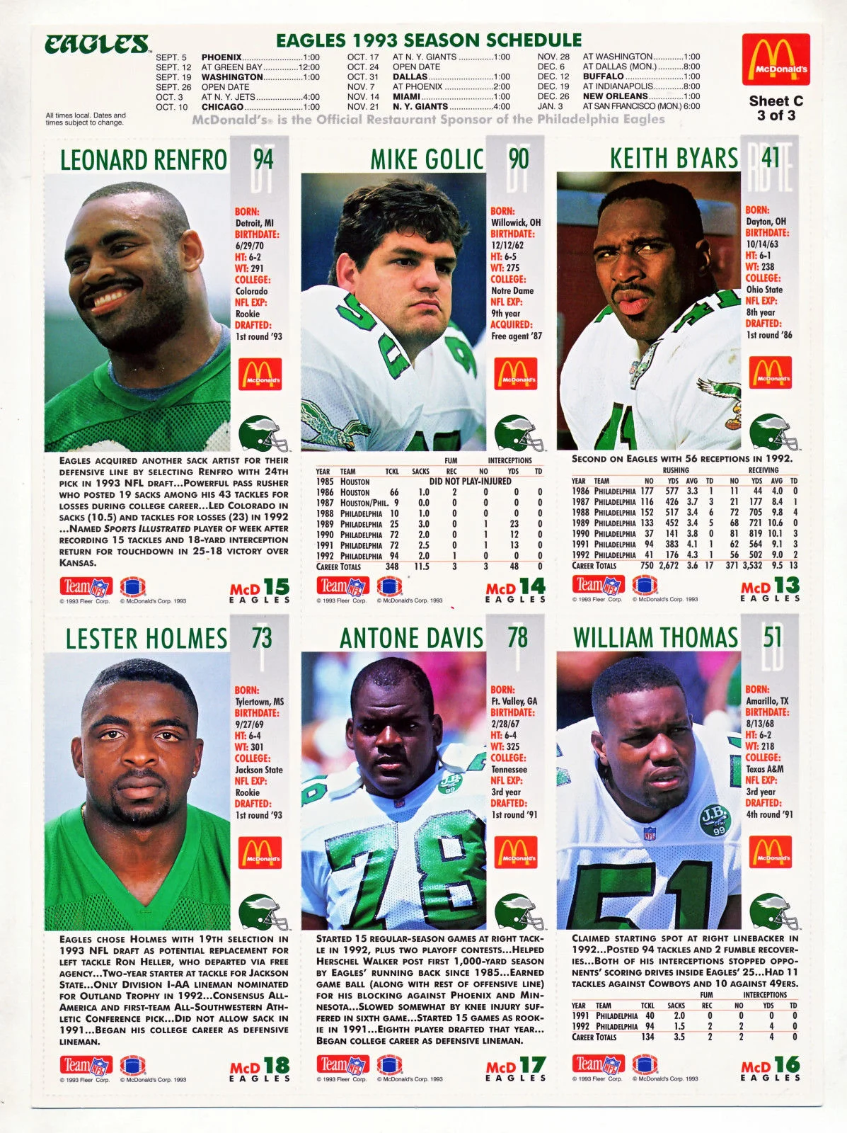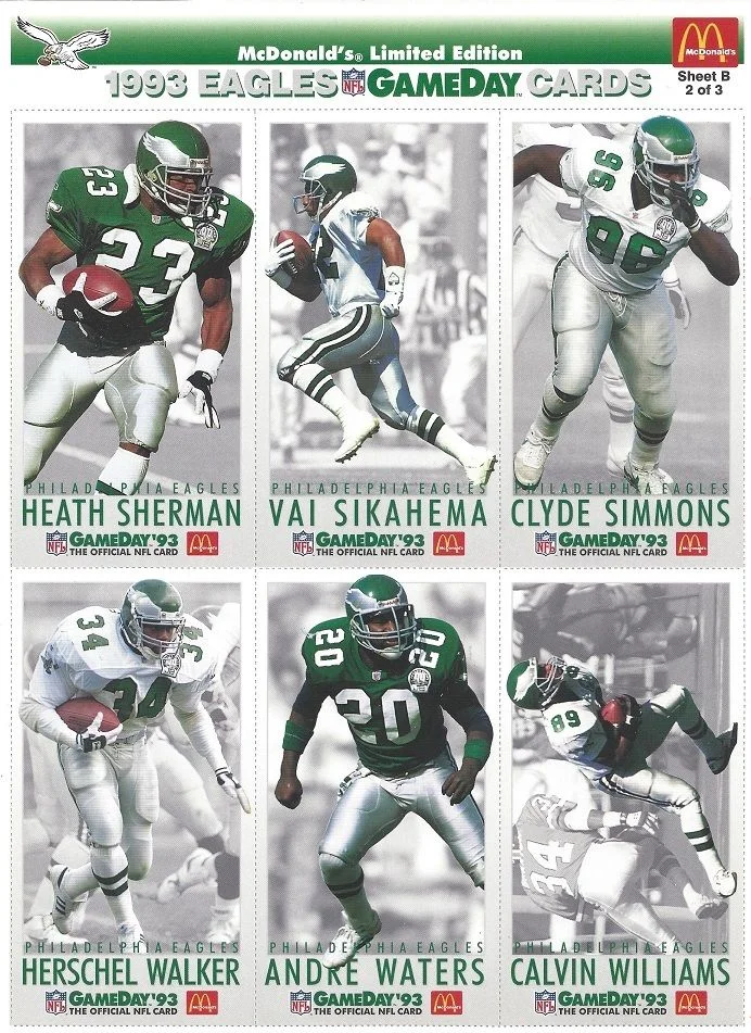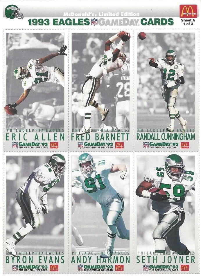 In the Fall of 1993, the NFL partnered with McDonald's restaurants to distribute Game Day football cards in their various team markets. For three weeks, collectors across the Tri-State area scrambled to assemble the Eagles 18-card set - which were individually available at participating stores.