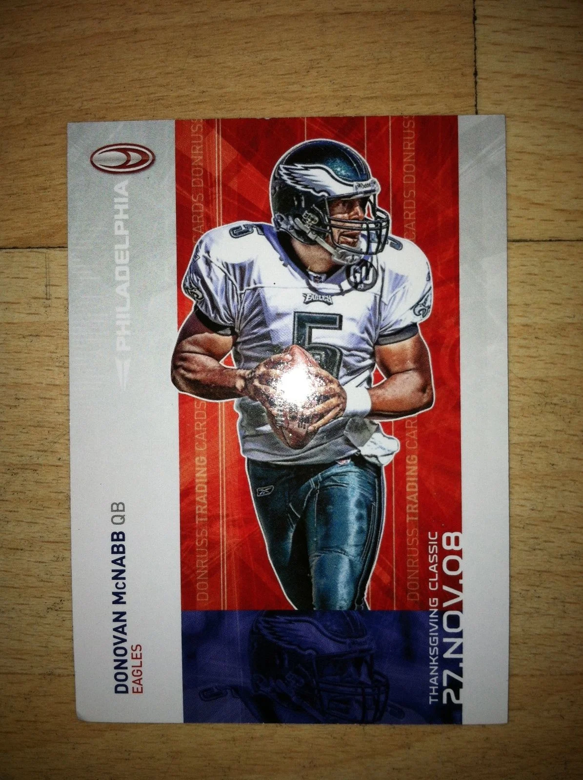 In 2008 the Eagles played the Cardinals in a Thanksgiving night game on the NFL Network. And for the third year in a row, Donruss marked the occasion by sponsoring a rare stadium giveaway, pack of cards.
