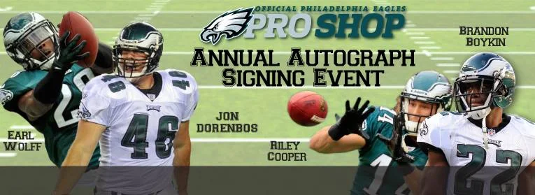 In celebration of their first year anniversary, the Eagles Pro Shop in Cherry Hill (Market Place at Garden State Park) will be hosting their own autograph event on June 14th. Like the Lancaster event, this one promises family fun with Swoop and several Eagles players signing autographs. Scheduled signers/times are listed below: