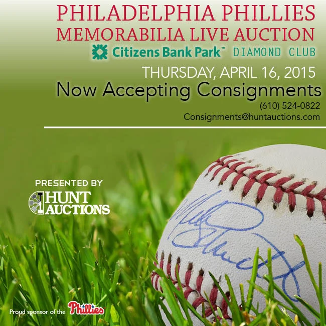 Hunt Auctions announced via email today that they will hold a Phillies-themed live auction this Spring. The "Philadelphia Phillies Memorabilia Live Auction" will be held at the Diamond Club in Citizens Bank Park on April 16th.