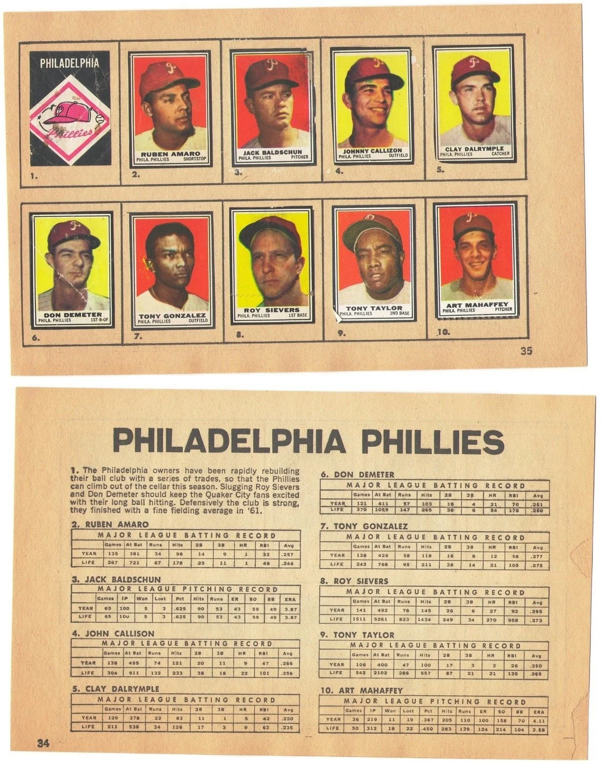 Following the 1961 release model, 1962 Topps Stamps were inserted into wax packs of 1962 Topps baseball cards. Originally found in two-stamp panels, the set consists of 201 stamps - 181 players and 20 team logo stamps. Roy Sievers actually appears twice - once incorrectly as an Kansas City Athletic, then correctly as a Phillie.