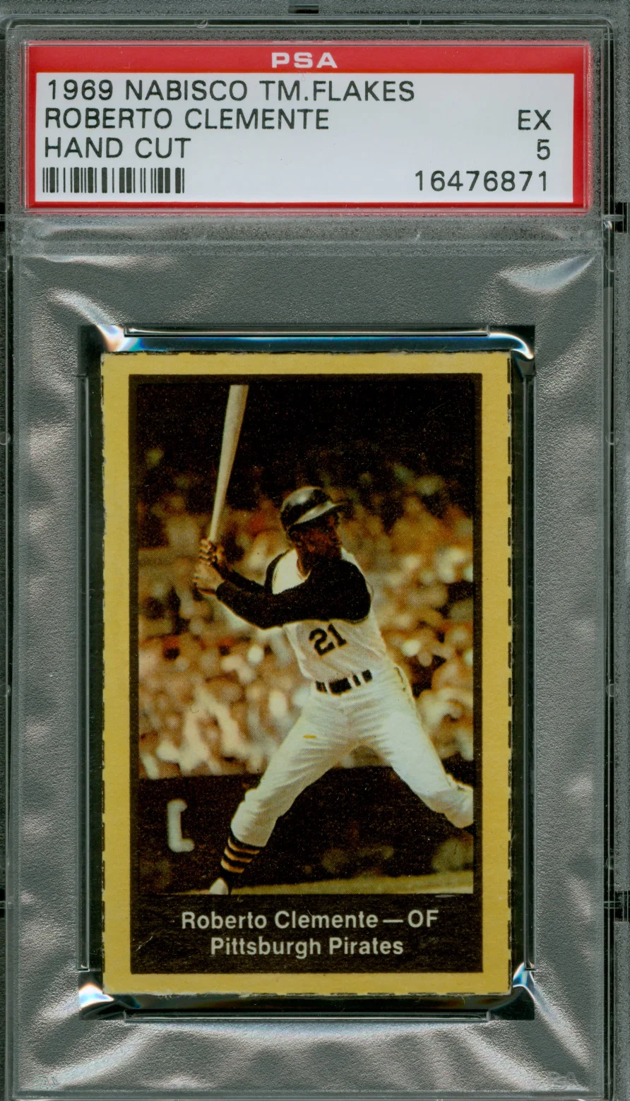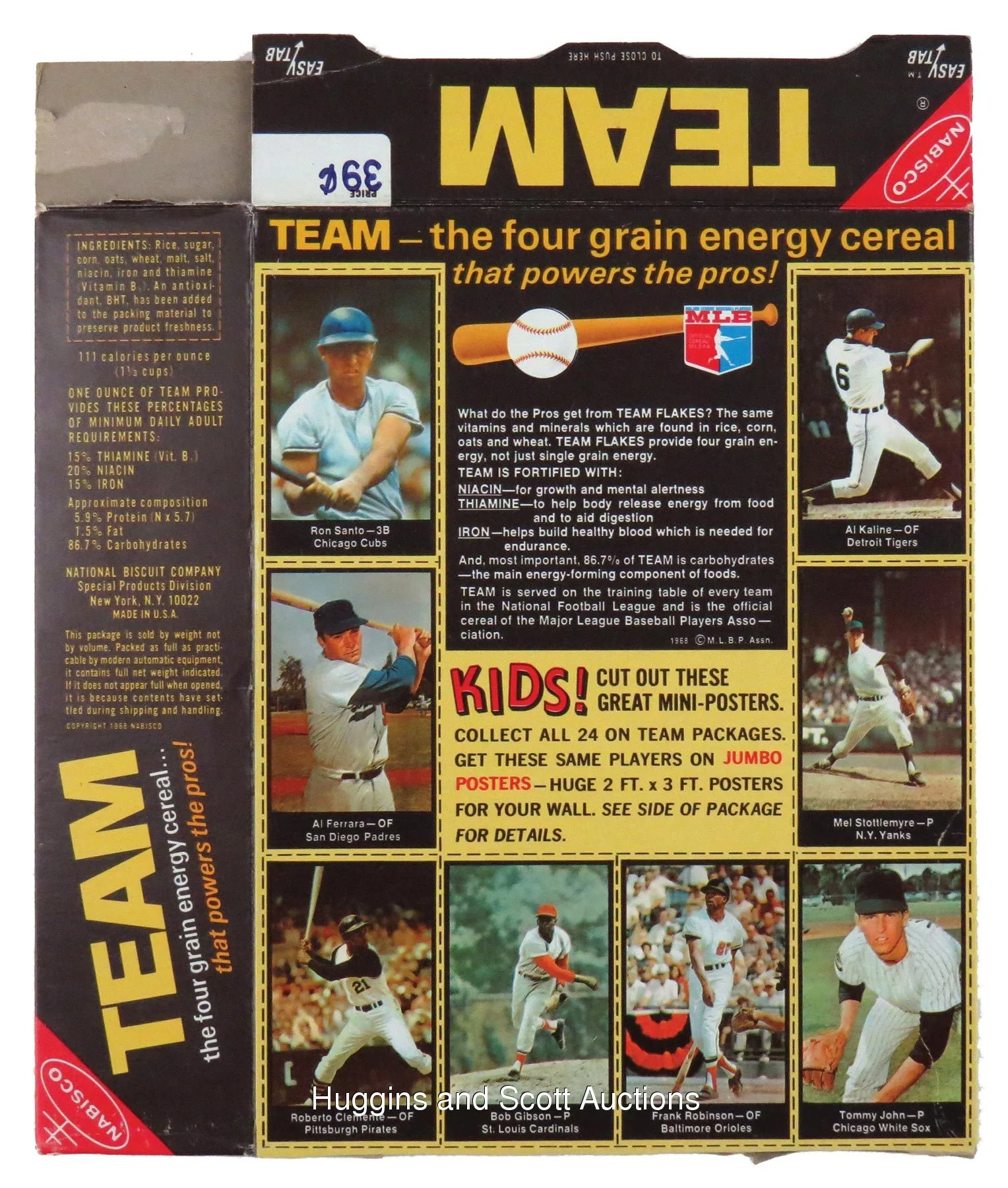 In 1969, the Nabisco Company offered a set of 24 "mini-posters" on the back of their "Team Flakes" cereal boxes. The posters were actually 2"x3" color cards featuring would-be Hall of Famers and assorted stars of the day. Issued in panels of eight, the individual cards were separated by a dotted line, and required hand-cutting. The fronts feature a color action photo of the player, surrounded by a yellow border. A black box at the bottom lists the player's name, position and team. Photos have been edited to remove team logos. Note: There are two border variations available - the "normal" one, and a wider one (as shown in the Clemente card below).