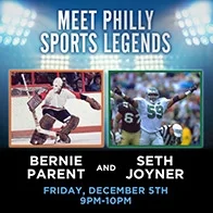 Legends Bernie Parent and Seth Joyner will be appearing at the Valley Forge Casino Resort on Friday, December 5th. The meet-and-greet will take place in Center Bar from 9:00 - 10:00 PM.
